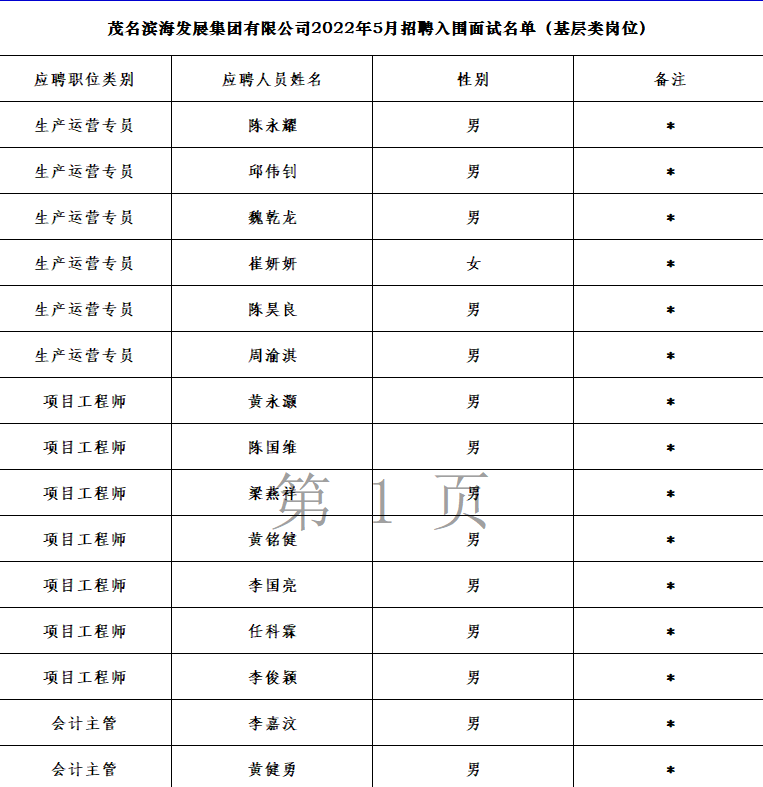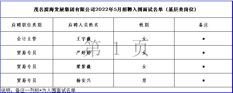 根據(jù)《茂名濱海發(fā)展集團有限公司2022年5月入圍面試名單》精神,現(xiàn)將入圍面試的名單進行公示。