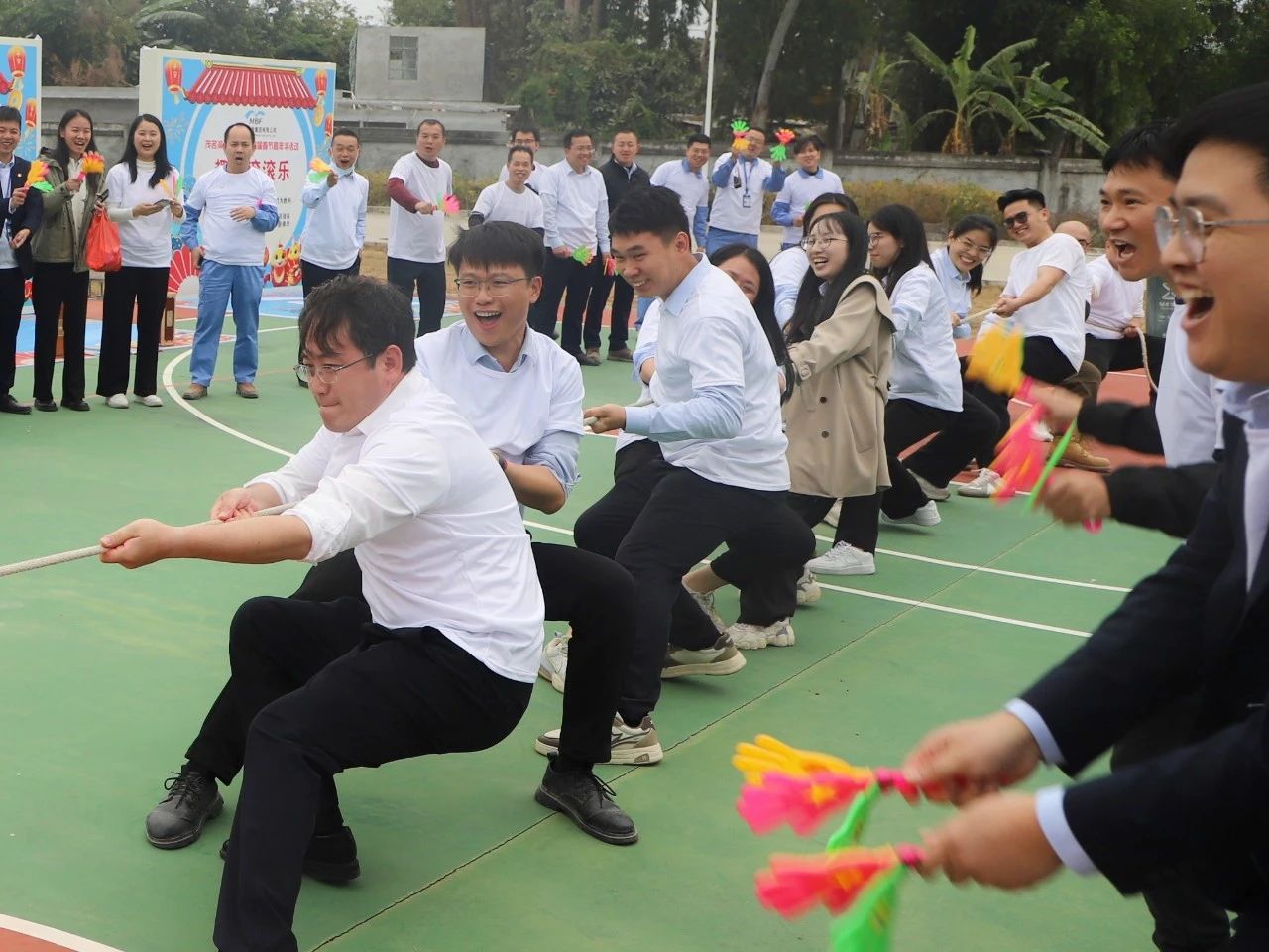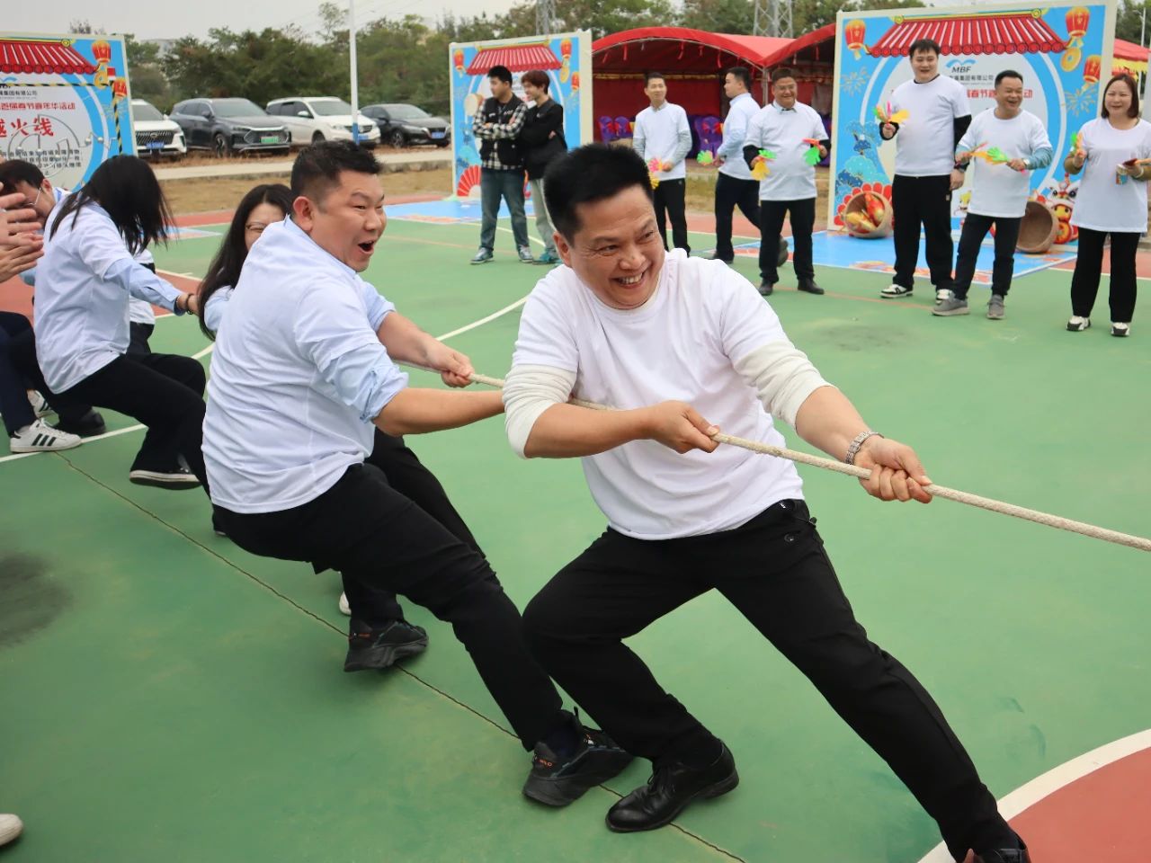 下午四時(shí)許,游園活動(dòng)正式拉開(kāi)帷幕。首先進(jìn)行的是拔河比賽,由集團(tuán)黨委書(shū)記、董事長(zhǎng)呂崇君親自帶領(lǐng)集團(tuán)領(lǐng)導(dǎo)班子輪番上陣,各部門(mén)代表踴躍參與,隨后是部門(mén)與部門(mén)之間自由角逐。現(xiàn)場(chǎng)中,拔河參賽隊(duì)員各就各位,扎好步、把好麻繩,當(dāng)比賽的哨聲響起,雙手緊握長(zhǎng)繩,憋足了勁拼命往后拉。“一二,加油;一二,加油”,現(xiàn)場(chǎng)啦啦隊(duì)員更是個(gè)個(gè)熱情高漲,紛紛在旁加油助威,吶喊聲、鼓掌聲、歡笑聲此起彼伏,精彩紛呈,賽場(chǎng)已然是一片歡樂(lè)的海洋。