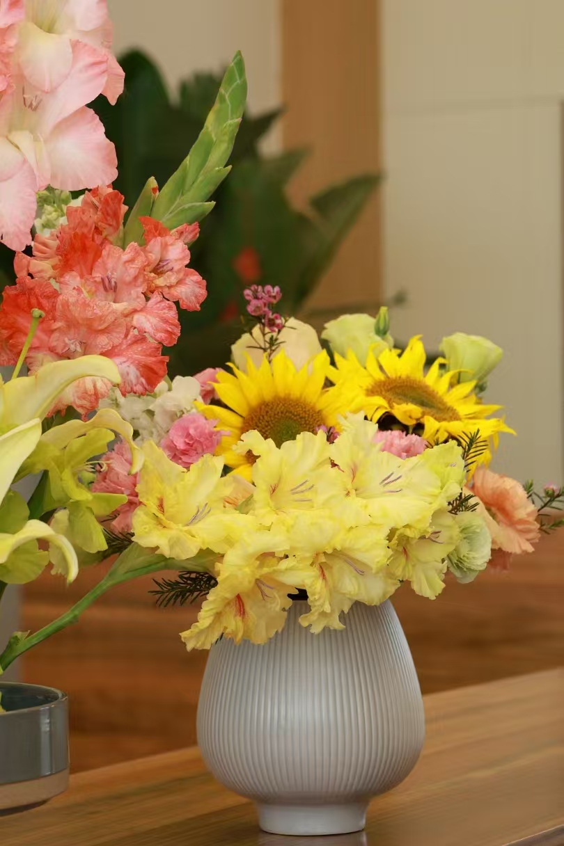 專業(yè)花藝師從色彩搭配、造型設(shè)計(jì)到花材養(yǎng)護(hù)展開生動講解,將插花藝術(shù)與生活美學(xué)娓娓道來。女職工們化身“春日造夢師”,修枝剪葉、構(gòu)思層次,指尖流轉(zhuǎn)間,原本零散的花材逐漸煥發(fā)新生。有人將玫瑰與康乃馨編織成古典花甕,盡顯端莊大氣;有人以向日葵搭配綠植打造田園風(fēng)花籃,充滿生機(jī)活力。現(xiàn)場歡聲笑語不斷,四十余件作品或清雅秀麗,或熱烈奔放,宛若一首首無聲的春日詩篇。
